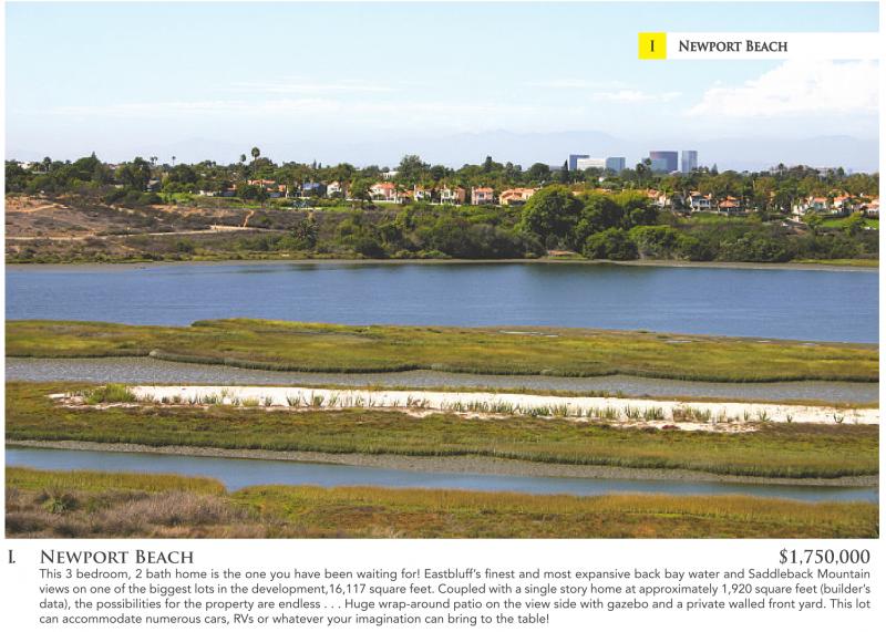 INewport Beach Newport Beach I. Newport Beach $1,750,000 This 3 bedroom, 2 bath home is the one you have been waiting for! Eastbluff’s finest and most expansive back bay water and Saddleback Mountain views on one of the biggest lots in the development,16,117 square feet. Coupled with a single story home at approximately 1,920 square feet (builder’s data), the possibilities for the property are endless . . . Huge wrap-around patio on the view side with gazebo and a private walled front yard. This lot can accommodate numerous cars, RVs or whatever your imagination can bring to the table!