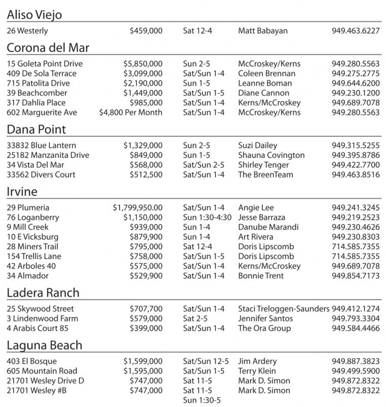 15 Goleta Point Drive $5,850,000 Sun 2-5 McCroskey/Kerns 949.280.5563 409 De Sola Terrace $3,099,000 Sat/Sun 1-4 Coleen Brennan 949.275.2775 715 Patolita Drive $2,190,000 Sun 1-5 Leanne Boman 949.644.6200 39 Beachcomber $1,449,000 Sat/Sun 1-5 Diane Cannon 949.230.1200 317 Dahlia Place $985,000 Sat/Sun 1-4 Kerns/McCroskey 949.689.7078 602 MargueriteAve $4,800 PerMonth Sat/Sun 1-4 McCroskey/Kerns 949.280.5563
