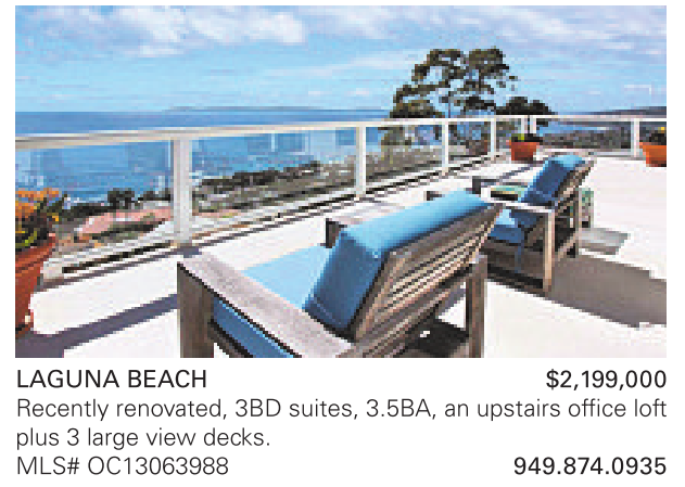 LAGUNA BEACH $2,199,000 Recently renovated, 3BD suites, 3.5BA, an upstairs office loft plus 3 large view decks. MLS# OC13063988 949.874.0935