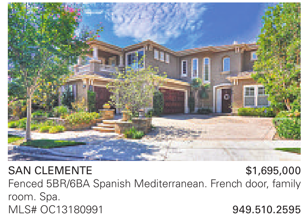 SAN CLEMENTE $1,695,000 Fenced 5BR/6BA Spanish Mediterranean. French door, family room. Spa. MLS# OC13180991 949.510.2595