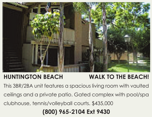 HUNTINGTON BEACH WALK TO THE BEACH! This 3BR/2BAunit features aspacious living room with vaulted ceilings and aprivate patio. Gated complex with pool/spa clubhouse, tennis/volleyball courts. $435,000 (800) 965-2104 Ext 9430
