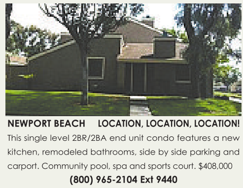 NEWPORT BEACH LOCATION, LOCATION, LOCATION! This single level 2BR/2BA end unit condo features anew kitchen, remodeled bathrooms, side by side parking and carport. Community pool, spa and sports court. $408,000 (800) 965-2104 Ext 9440