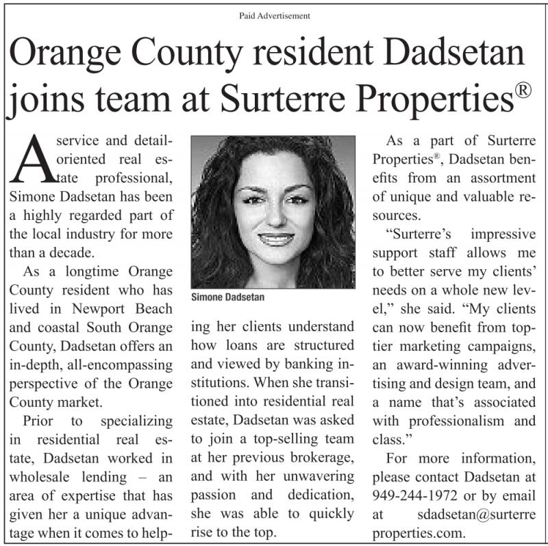 As a longtime Orange County resident who has lived in Newport Beach and coastal South Orange County, Dadsetan offers an in-depth, all-encompassing perspective of the Orange County market.