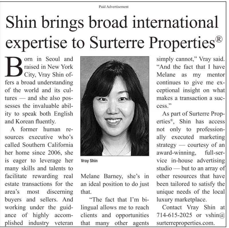 As part of Surterre Properties ® , Shin has access not only to professionally executed marketing strategy — courtesy of an award-winning, full-service in-house advertising studio — but to an array of other resources that have been tailored to satisfy the unique needs of the local luxury marketplace.
