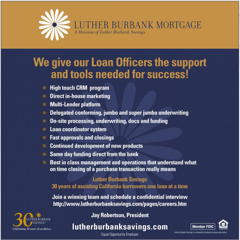 71 We give our Loan Officers the support and tools needed for success! High touch CRM program Direct in-house marketing Multi-Lender platform Delegated conforming, jumbo and super jumbo underwriting On-site processing, underwriting, docs and funding Loan coordinator system Fast approvals and closings Continued development of new products Same day funding direct from the bank Best in class management and operations that understand what on time closing of a purchase transaction really means Luther Burbank Savings 30 years of assisting California borrowers one loan at a time Join a winning team and schedule a confidential interview http://www.lutherburbanksavings.com/pages/careers.htm Celebrating 30 years of excellence Jay Robertson, President lutherburbanksavings.com Equal Opportunity Employer Member FDIC Luther Burbank Savings is afederally chartered savings association.