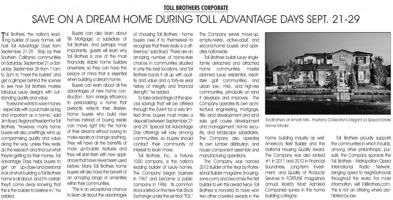 brothers, the nation’s leading builder of luxury homes, will host Toll advantage days from September 21-29. Stop by their Southern California communities on Saturday, September 21 or Saturday, September 28 from 11am to 2pm to “meet the builder” and get a glimpse behind the scenes to see how Toll brothers marries fabulous luxury designs with outstanding quality and value.