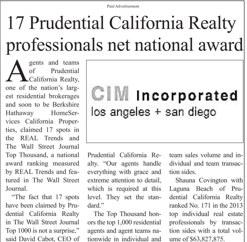 Paid Advertisement 17 Prudential California Realty professionals net national award Agents and teams of Prudential California Realty, one of the nation’s largest residential brokerages and soon to be Berkshire Hathaway HomeServices California Properties, claimed 17 spots in the REAL Trends and The Wall Street Journal Top Thousand, a national award ranking measured by REAL Trends and featured in The Wall Street Journal. “The fact that 17 spots have been claimed by Prudential California Realty in The Wall Street Journal Top 1000 is not a surprise,” said David Cabot, CEO of Prudential California Realty. “Our agents handle everything with grace and extreme attention to detail, which is required at this level. They set the standard.” The Top Thousand honors the top 1,000 residential agents and agent teams nationwide in individual and team sales volume and individual and team transaction sides. Shauna Covington with Laguna Beach of Prudential California Realty ranked No. 171 in the 2013 top individual real estate professionals by transaction sides with a total volume of $63,827,875. See also
