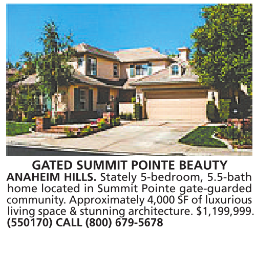 GATED SUMMIT POINTE BEAUTY ANAHEIM HILLS. Stately 5-bedroom, 5.5-bath home located in Summit Pointe gate-guarded community.Approximately 4,000 SF of luxurious living space&stunning architecture. $1,199,999. (550170) CALL (800) 679-5678