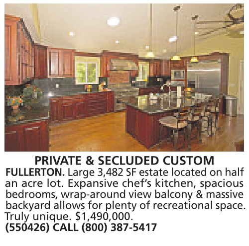 PRIVATE & SECLUDED CUSTOM FULLERTON. Large 3,482 SF estate located on half an acre lot. Expansive chef’s kitchen, spacious bedrooms, wrap-around view balcony &massive backyard allows forplenty of recreational space. Truly unique. $1,490,000. (550426) CALL (800) 387-5417