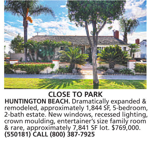 CLOSE TO PARK HUNTINGTON BEACH. Dramatically expanded & remodeled, approximately 1,844 SF,5-bedroom, 2-bath estate. New windows, recessed lighting, crown moulding, entertainer’ssize family room & rare, approximately 7,841 SF lot. $769,000. (550181) CALL (800) 387-7925