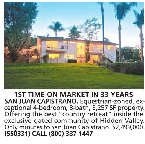 1ST TIME ON MARKET IN 33 YEARS SAN JUAN CAPISTRANO. Equestrian-zoned, exceptional 4-bedroom, 3-bath, 3,257 SF property. Offering the best “country retreat” inside the exclusive gated community of Hidden Valley. Only minutes to San Juan Capistrano. $2,499,000. (550331) CALL (800) 387-1447