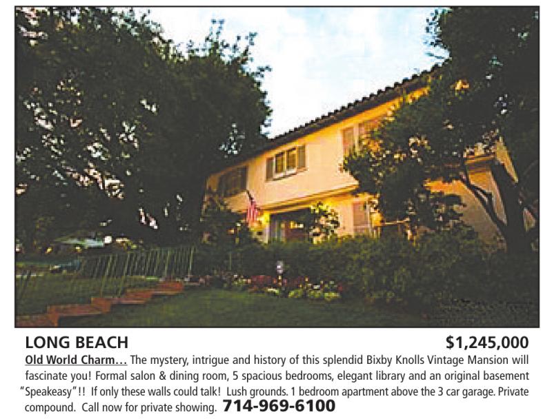 LONG BEACH $1,245,000 Old World Charm… The mystery,intrigue and history of this splendid Bixby Knolls Vintage Mansion will fascinate you! Formal salon & dining room, 5 spacious bedrooms,elegant library and an original basement “Speakeasy”!! If only these walls could talk! Lush grounds.1bedroom apartment above the 3car garage.Private compound. Call now for private showing. 714-969-6100