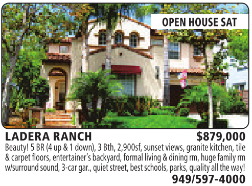 LADERA RANCH $879,000 Beauty!5BR(4up&1down),3Bth, 2,900sf, sunset views, granite kitchen,tile &carpetfloors,entertainer’s backyard,formal living &diningrm, huge family rm w/surroundsound, 3-cargar., quietstreet, bestschools,parks,qualityall theway!