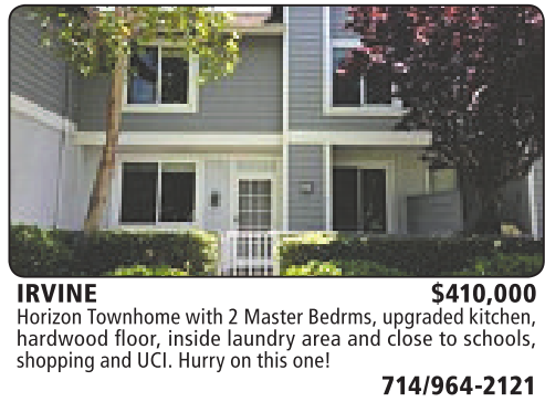 IRVINE $410,000 HorizonTownhome with 2MasterBedrms, upgraded kitchen, hardwood floor, inside laundry area and close to schools, shoppingand UCI. Hurryonthis one!