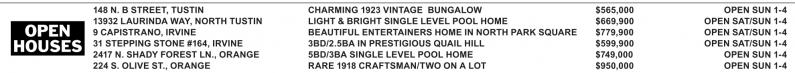 OPEN HOUSES 148 N. B STREET, TUSTIN CHARMING 1923 VINTAGE BUNGALOW $565,000 OPEN SUN 1-4 13932 LAURINDA WAY, NORTH TUSTIN LIGHT & BRIGHT SINGLE LEVEL POOL HOME $669,900 OPEN SAT/SUN 1-4 9 CAPISTRANO, IRVINE BEAUTIFUL ENTERTAINERS HOME IN NORTH PARK SQUARE $779,900 OPEN SAT/SUN 1-4 31 STEPPING STONE #164, IRVINE 3BD/2.5BA IN PRESTIGIOUS QUAIL HILL $599,900 OPEN SAT/SUN 1-4 2417 N. SHADY FOREST LN., ORANGE 5BD/3BA SINGLE LEVEL POOL HOME $749,000 OPEN SUN 1-4 224 S. OLIVE ST., ORANGE RARE 1918 CRAFTSMAN/TWO ON A LOT $950,000 OPEN SUN 1-4
