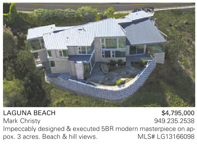 LAGUNA BEACH $4,795,000 Mark Christy 949.235.2538 Impeccably designed & executed 5BR modern masterpiece on appox. 3 acres. Beach & hill views. MLS# LG13166098