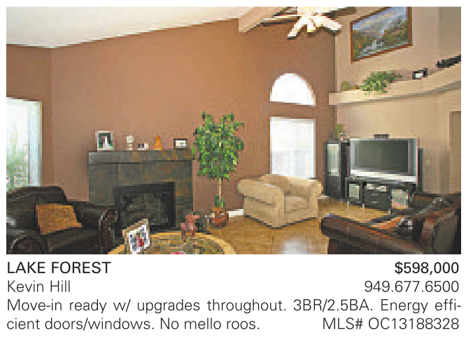 LAKE FOREST $598,000 Kevin Hill 949.677.6500 Move-in ready w/ upgrades throughout. 3BR/2.5BA. Energy efficient doors/windows. No mello roos. MLS# OC13188328