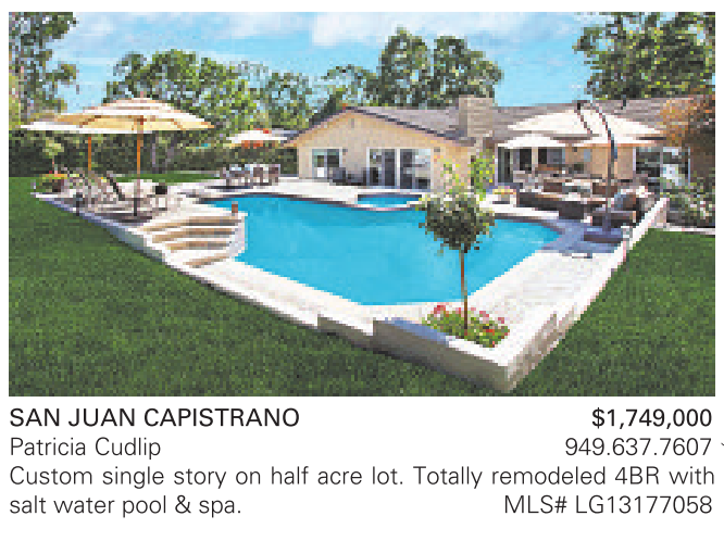 SAN JUAN CAPISTRANO $1,749,000 Patricia Cudlip 949.637.7607 Custom single story on half acre lot. Totally remodeled 4BR with salt water pool & spa. MLS# LG13177058