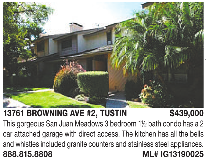 13761 BROWNING AVE #2, TUSTIN $439,000 This gorgeous San Juan Meadows 3bedroom 1½ bathcondohas a2 car attached garage with direct access! The kitchen has all the bells andwhistlesincluded granitecounters andstainless steelappliances. 888.815.8808 ML# IG13190025