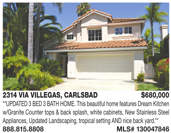 2314 VIA VILLEGAS, CARLSBAD $680,000 **UPDATED 3BED 3BATHHOME. This beautiful home features Dream Kitchen w/Granite Counter tops & back splash, white cabinets, New Stainless Steel Appliances, Updated Landscaping, tropical setting AND nice back yard.** 888.815.8808 MLS# 130047846