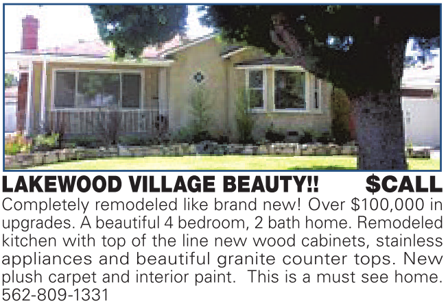 LAKEWOOD VILLAGE BEAUTY!! $CALL Completely remodeled like brand new! Over $100,000 in upgrades. A beautiful 4 bedroom, 2 bath home. Remodeled kitchen with top of the line new wood cabinets, stainless appliances and beautiful granite counter tops. New plush carpet and interior paint. This is a must see home. 562-809-1331
