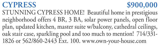 CYPRESS $900,000 STUNNING CYPRESS HOME! Beautiful home in prestigious neighborhood offers 4 BR, 3 BA, solar power panels, open floor plan, updated kitchen, master suite w/balcony, cathedral ceilings, oak stair case, sparkling pool and too much to mention! 714/331- 1826 or 562/860-2443 Ext. 100. www.own-your-house.com
