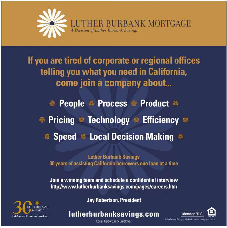 If you are tired of corporate or regional offices telling you what you need in California, come join a company about... People Process Product Pricing Technology Efficiency Speed Local Decision Making Luther Burbank Savings 30 years of assisting California borrowers one loan at a time Join a winning team and schedule a confidential interview http://www.lutherburbanksavings.com/pages/careers.htm Jay Robertson, President Celebrating 30 years of excellence lutherburbanksavings.com Equal Opportunity Employer Member FDIC Luther Burbank Savings is afederally chartered savings association.