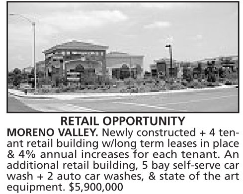 RETAIL OPPORTUNITY MORENO VALLEY. Newly constructed + 4 tenant retail building w/long term leases in place & 4% annual increases for each tenant. An additional retail building, 5 bay self-serve car wash + 2 auto car washes, & state of the art equipment. $5,900,000
