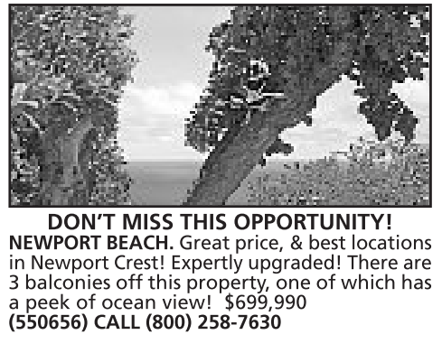 NEWPORTBEACH. Great price, &best locations in Newport Crest! Expertly upgraded! There are 3balconies off this property, one of which has a peek of ocean view! $699,990 (550656) CALL (800) 258-7630