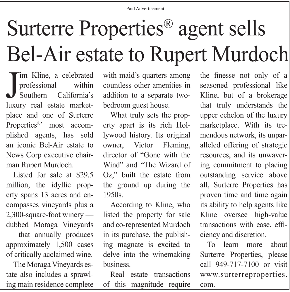 Kline, a celebrated professional within Southern California’s luxury real estate marketplace and one of Surterre Properties ® ’ most accomplished agents, has sold an iconic Bel-Air estate to News Corp executive chairman Rupert Murdoch.