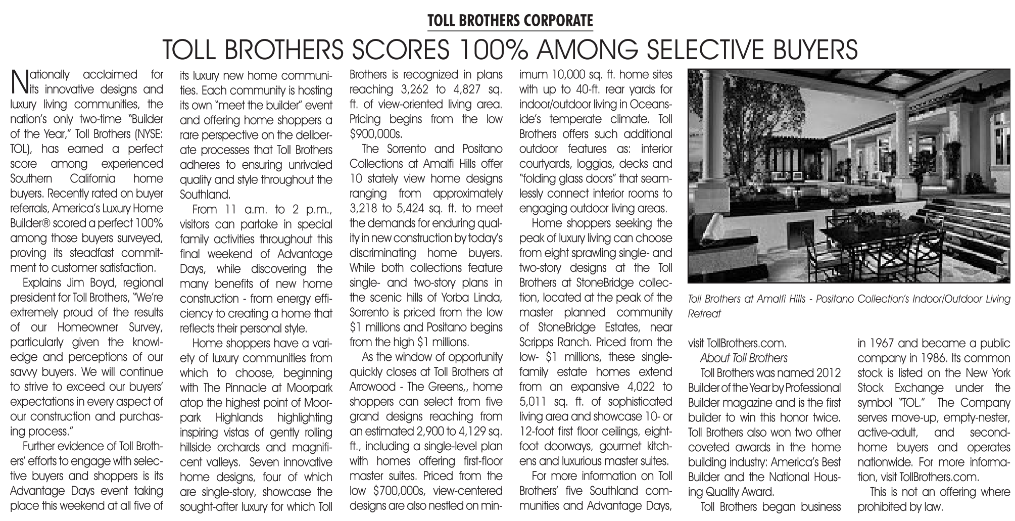 of the year,” Toll Brothers (nySe: TOl), has earned a perfect score among experienced Southern California home buyers. recently rated on buyer referrals, america’s luxury Home Builder® scored aperfect 100% among those buyers surveyed, proving its steadfast commitment to customer satisfaction.