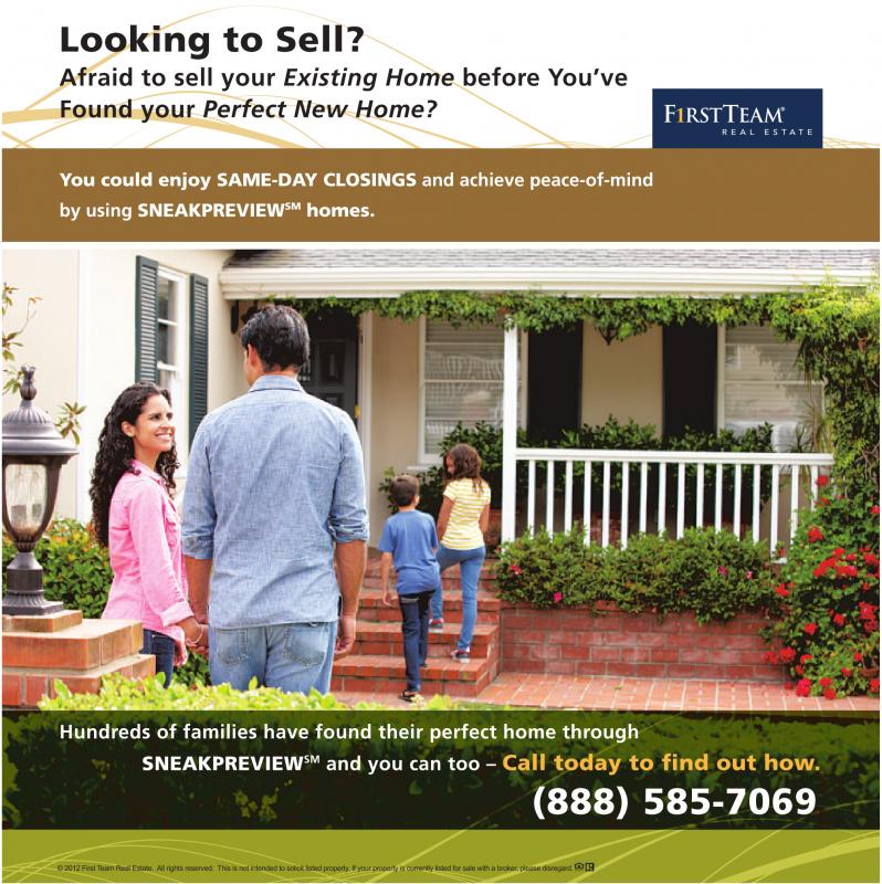 Looking to Sell? Afraid to sell your Existing Home before You’ve Found your Perfect New Home? You could enjoy SAME-DAY CLOSINGS and achieve peace-of-mind by using SNEAKPREVIEW SM homes. Hundreds of families have found their perfect home through SNEAKPREVIEW SM and you can too – Call today to find out how. (888) 585-7069 28 ©2012 First Team Real Estate. All rights reserved. This is not intended to solicit listed property.Ifyour property is currently listed for sale with abroker,please disregard.