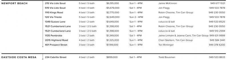 NEWPORT BEACH 215 Via Lido Soud 5 bed | 5 bath $6,195,000 Sun 1 - 4PM Jamie McKinnon 949 677 1021 515 Via Lido Soud 4 bed | 4 bath $5,679,000 Sat 1 - 4PM Jon Flagg 949 533 7878 1110 Kings Road 4 bed | 3 bath $2,775,000 Sun 1 - 4PM Robin Chesnie, Tim Carr Group 949 230 0550 120 Via Trieste 5 bed | 5 bath $2,649,000 Sun 2 - 4PM Jon Flagg 949 533 7878 1349 Sussex Lane 3 bed | 2 bath $1,649,000 Sun 1 - 4PM coluccio & ball 949 533 8525 1521 Cumberland Lane 3 bed | 2.5 bath $1,398,000 Sat 1 - 4PM Robin Chesnie, Tim Carr Group 949 230 0550 1521 Cumberland Lane 3 bed | 2.5 bath $1,398,000 Sun 1 - 4PM coluccio & ball 949 510 2594 1135 Pembroke 3 bed | 2 bath $1,349,000 Sat 1 - 4PM Jaime Linholm &Jeanne Carni, Tim Carr Group 949 631 9999 2015 Highland Road 4 bed | 2 bath $1,325,000 Sun 1 - 4PM Cheri Skellern, Tim Carr Group 949 584 3441 401 Prospect Street 3 bed | 3 bath $1,199,000 Sun 1 - 4PM Tori Rimlinger 949 378 6200