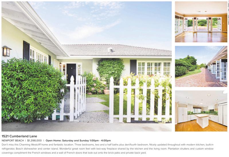 1521 Cumberland Lane NEWPORT BEACH | $1,398,000 | Open Home: Saturday and Sunday 1:00pm - 4:00pm Don’t miss this Charming Westcliff home and fantastic location. Three bedrooms, two and a half baths plus den/fourth bedroom. Nicely updated throughout with modern kitchen, built-in refrigerator, Bosch dishwasher and center island. Wonderful great room feel with two-way fireplace shared by the kitchen and the living room. Plantation shutters and custom window coverings compliment the French windows and a wall of French doors that look out onto the brick patio and private back yard.