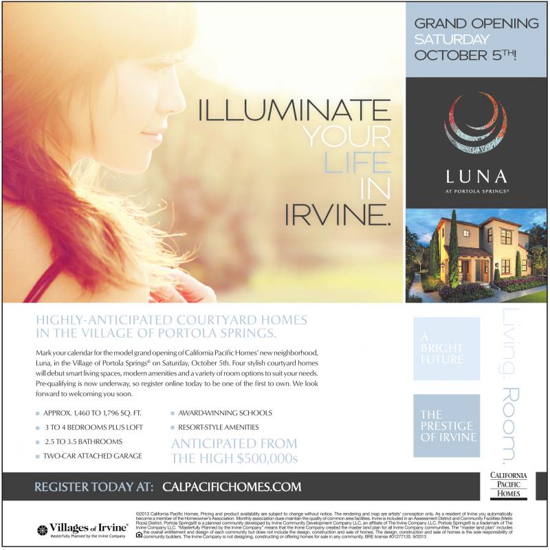 12 ILLUMINATE YOUR LIFE IN IRVINE. GRAND OPENING SATURDAY OCTOBER 5 TH ! HIGHLY-ANTICIPATED COURTYARD HOMES IN THE VILLAGE OF PORTOLA SPRINGS. Mark your calendar for the model grand opening of California Pacific Homes’ new neighborhood, Luna, in the Village of Portola Springs ® on Saturday, October 5th. Four stylish courtyard homes will debut smart living spaces, modern amenities and avariety of room options to suit your needs. Pre-qualifying is now underway, so register online today to be one of the first to own. We look forward to welcoming you soon. APPROX.1,460 TO 1,796 SQ. FT. 3TO4BEDROOMS PLUS LOFT 2.5 TO 3.5 BATHROOMS TWO-CAR ATTACHED GARAGE AWARD-WINNING SCHOOLS RESORT-STYLE AMENITIES ANTICIPATED FROM THE HIGH $500,000s REGISTER TODAY AT: CALPACIFICHOMES.COM A BRIGHT FUTURE THE PRESTIGE OF IRVINE ©2013 California Pacific Homes. Pricing and product availability are subject to change without notice. The rendering and map are artists’ conception only. Asaresident of Irvine you automatically become amember of the Homeowner’sAssociation. Monthly association dues maintain the quality of common area facilities. Irvine is included in an Assessment District and Community Facilities (Mello Roos) District. Portola Springs® is aplanned community developed by Irvine Community Development Company LLC, an affiliate of The Irvine Company LLC. Portola Springs® is atrademark of The Irvine Company LLC. “Masterfully Planned by the Irvine Company” means that the Irvine Company created the master land plan for all Irvine Company communities. The “master land plan” includes the overall entitlement and design of each community but does not include the design, construction and sale of homes. The design, construction and sale of homes is the sole responsibility of community builders. The Irvine Company is not designing, constructing or offering homes for sale in any community.BRE license #01277135. 9/2013