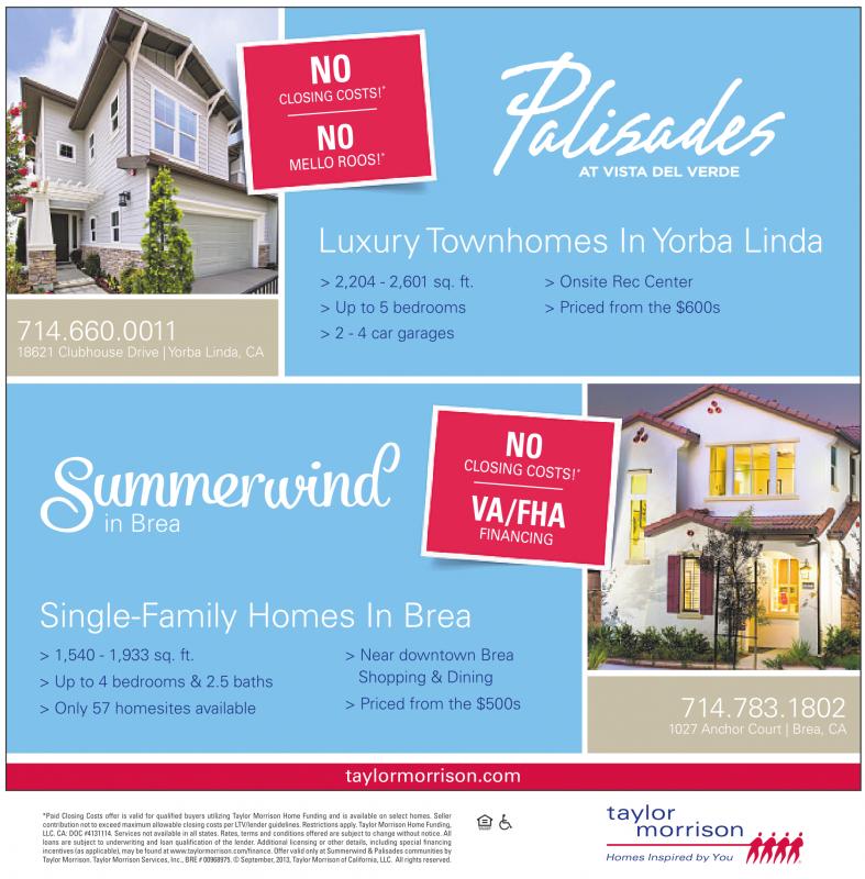 *Paid Closing Costs offer is valid for qualified buyers utilizing Taylor Morrison Home Funding and is available on select homes. Seller contribution not to exceed maximum allowable closing costs per LTV/lender guidelines. Restrictions apply.Taylor Morrison Home Funding, LLC. CA: DOC #4131114. Services not available in all states. Rates, terms and conditions offered are subject to change without notice. All loans are subject to underwriting and loan qualification of the lender. Additional licensing or other details, including special financing incentives (as applicable), may be found at www.taylormorrison.com/finance. Offer valid only at Summerwind &Palisades communities by Taylor Morrison. Taylor Morrison Services, Inc., BRE #00968975. ©September,2013, Taylor Morrison of California, LLC. All rights reserved.