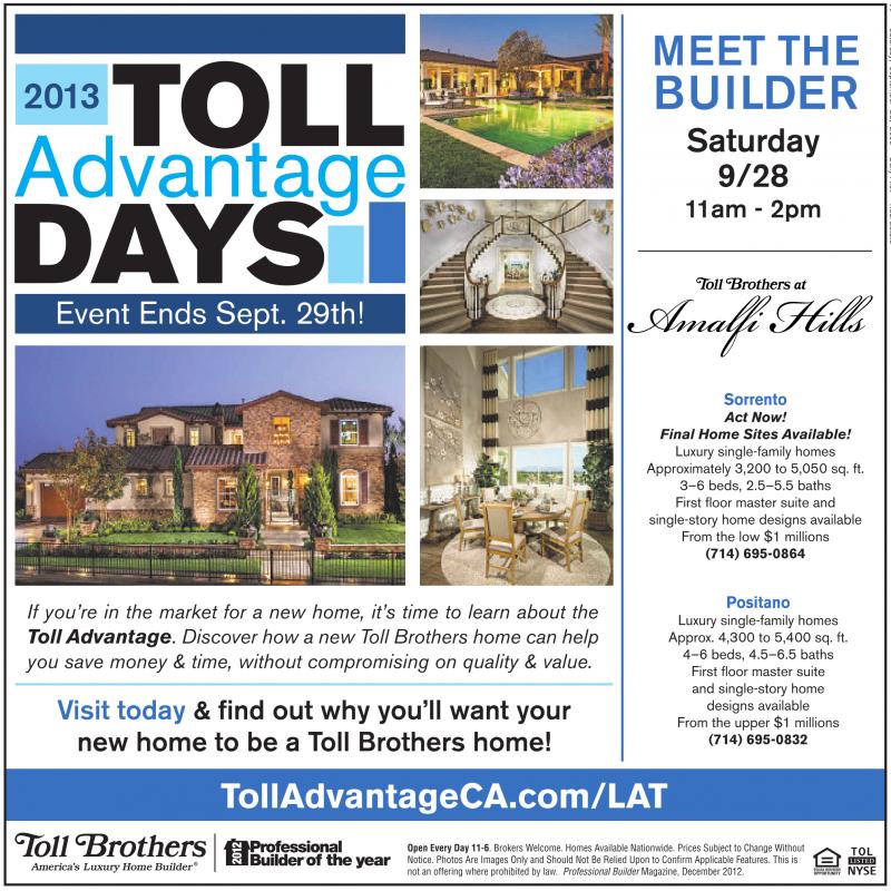 2013 TO LL Advantage DAYS Event Ends Sept. 29th! MEET THE BUILDER Saturday 9/28 11am - 2pm 15 Sorrento Act Now! Final Home Sites Available! Luxury single-family homes Approximately 3,200 to 5,050 sq. ft. 3–6 beds, 2.5–5.5 baths First floor master suite and single-story home designs available From the low $1 millions (714) 695-0864 If you’re in the market for a new home, it’s time to learn about the Toll Advantage. Discover how a new Toll Brothers home can help you save money & time, without compromising on quality & value. Visit today & find out why you’ll want your new home to be a Toll Brothers home! TollAdvantageCA.com/LAT Positano Luxury single-family homes Approx. 4,300 to 5,400 sq. ft. 4–6 beds, 4.5–6.5 baths First floor master suite and single-story home designs available From the upper $1 millions (714) 695-0832 Open EveryDay 11-6.Brokers Welcome. Homes Available Nationwide. Prices Subject to Change Without Notice. Photos Are Images Only and Should Not Be Relied Upon to Confirm Applicable Features. This is not an offering where prohibited by law. Professional Builder Magazine, December 2012.