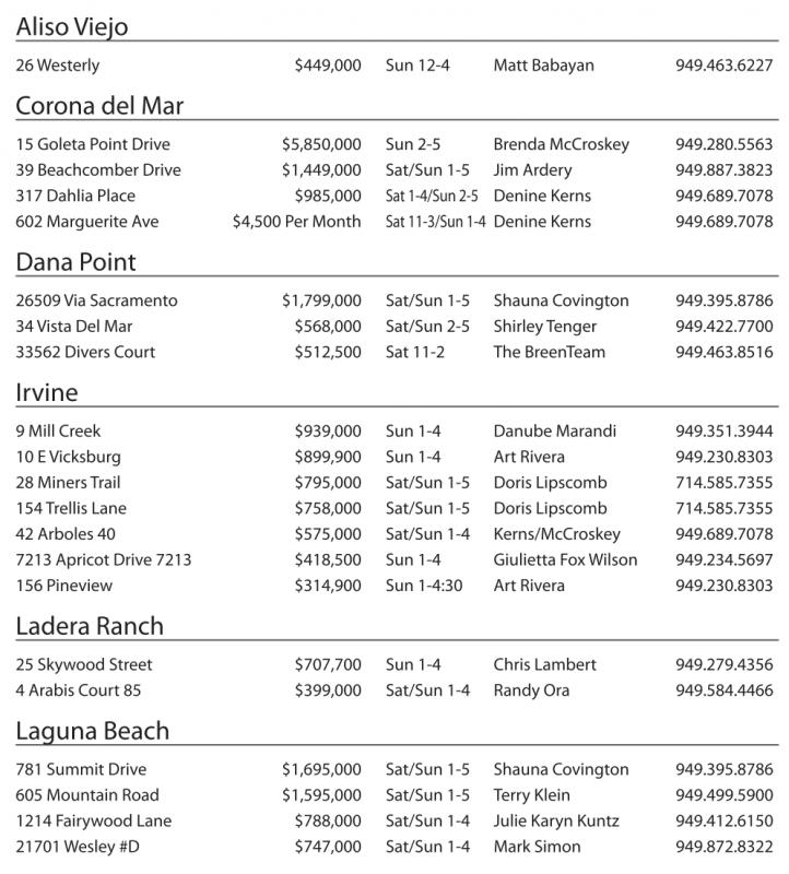 15 Goleta Point Drive $5,850,000 Sun 2-5 Brenda McCroskey 949.280.5563 39 Beachcomber Drive $1,449,000 Sat/Sun 1-5 Jim Ardery 949.887.3823 317 Dahlia Place $985,000 Sat 1-4/Sun 2-5 Denine Kerns 949.689.7078 602 MargueriteAve $4,500 PerMonth Sat 11-3/Sun 1-4 Denine Kerns 949.689.7078