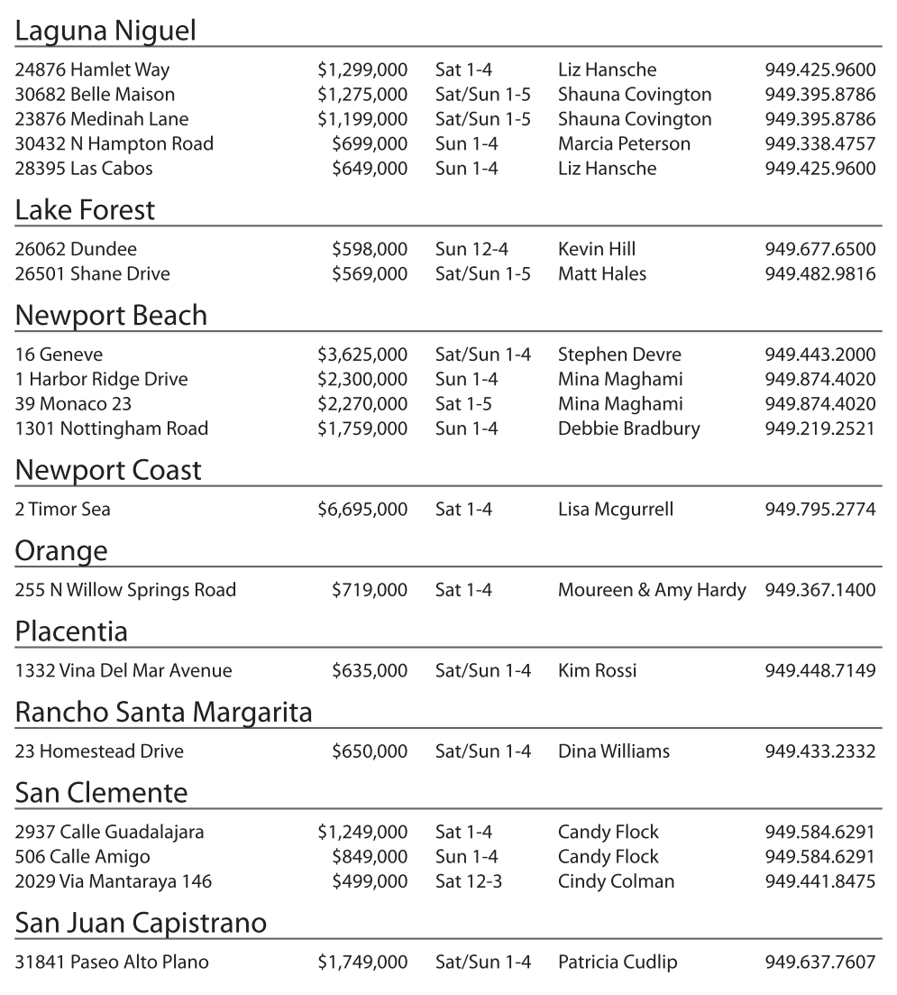 24876 Hamlet Way $1,299,000 Sat 1-4 Liz Hansche 949.425.9600 30682 Belle Maison $1,275,000 Sat/Sun 1-5 Shauna Covington 949.395.8786 23876 Medinah Lane $1,199,000 Sat/Sun 1-5 Shauna Covington 949.395.8786 30432 NHampton Road $699,000 Sun 1-4 Marcia Peterson 949.338.4757 28395 Las Cabos $649,000 Sun 1-4 Liz Hansche 949.425.9600
