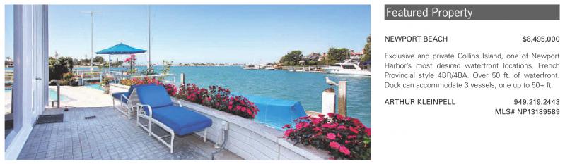 Featured Property NEWPORT BEACH $8,495,000 Exclusive and private Collins Island, one of Newport Harbor’s most desired waterfront locations. French Provincial style 4BR/4BA. Over 50 ft. of waterfront. Dock can accommodate 3 vessels, one up to 50+ ft. ARTHUR KLEINPELL 949.219.2443 MLS# NP13189589