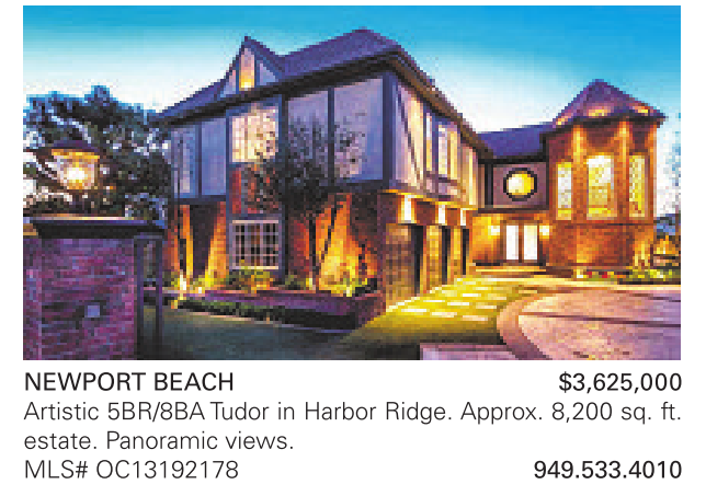 NEWPORT BEACH $3,625,000 Artistic 5BR/8BATudor in Harbor Ridge. Approx. 8,200 sq. ft. estate. Panoramic views. MLS# OC13192178 949.533.4010