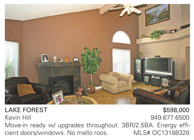 LAKE FOREST $598,000 Kevin Hill 949.677.6500 Move-in ready w/ upgrades throughout. 3BR/2.5BA. Energy efficient doors/windows. No mello roos. MLS# OC13188328
