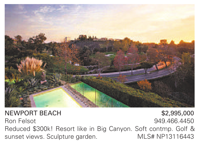 NEWPORT BEACH $2,995,000 Ron Felsot 949.466.4450 Reduced $300k! Resort like in Big Canyon. Soft contmp. Golf & sunset views. Sculpture garden. MLS# NP13116443