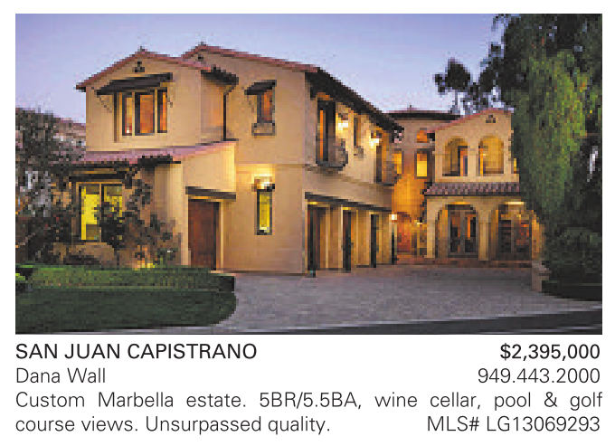 SAN JUAN CAPISTRANO $2,395,000 Dana Wall 949.443.2000 Custom Marbella estate. 5BR/5.5BA, wine cellar, pool & golf course views. Unsurpassed quality. MLS# LG13069293