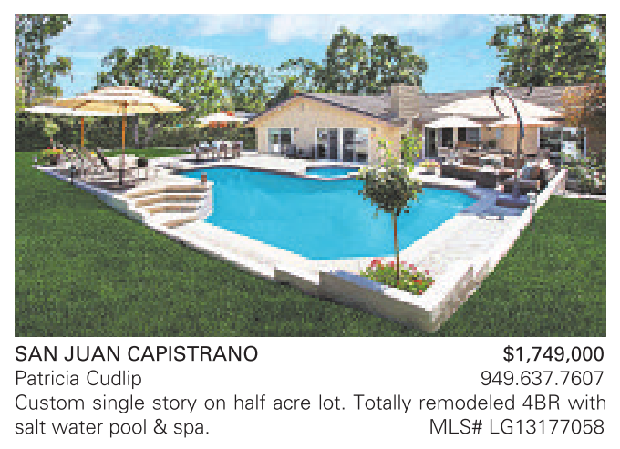 SAN JUAN CAPISTRANO $1,749,000 Patricia Cudlip 949.637.7607 Custom single story on half acre lot. Totally remodeled 4BR with salt water pool & spa. MLS# LG13177058