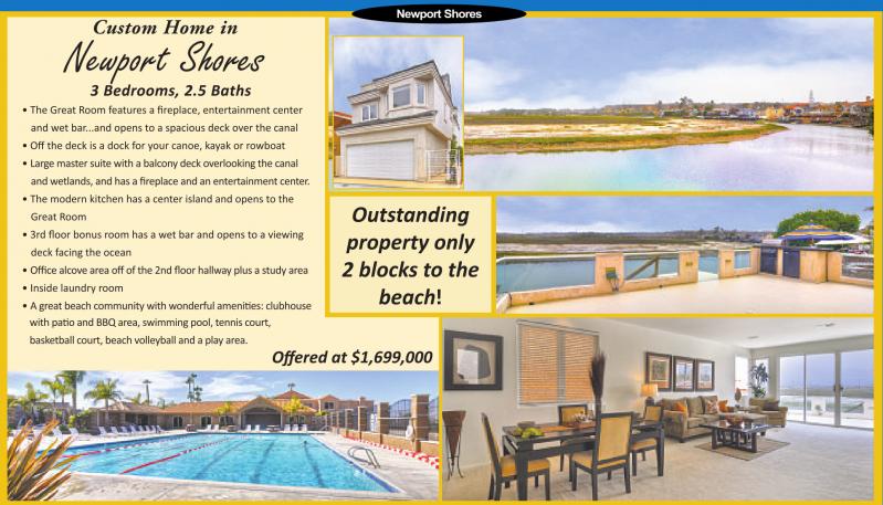 3 Bedrooms, 2.5 Baths • The Great Room features a fireplace, entertainment center and wet bar...and opens to a spacious deck over the canal • Off the deck is a dock for your canoe, kayak or rowboat • Large mastersuitewith abalconydeck overlooking thecanal and wetlands, and has afireplace and an entertainmentcenter. • The modern kitchen has a center island and opens to the Great Room • 3rd floor bonus room has a wet bar and opens to a viewing deck facing the ocean • Office alcove area off of the 2nd floor hallwayplus astudy area • Inside laundry room Custom Home in Newport Shores • Agreat beach community with wonderful amenities:clubhouse withpatioand BBQ area,swimming pool, tennis court, basketball court,beach volleyball and aplayarea. Newport Shores Outstanding property only 2 blocks to the beach! Offered at $1,699,000