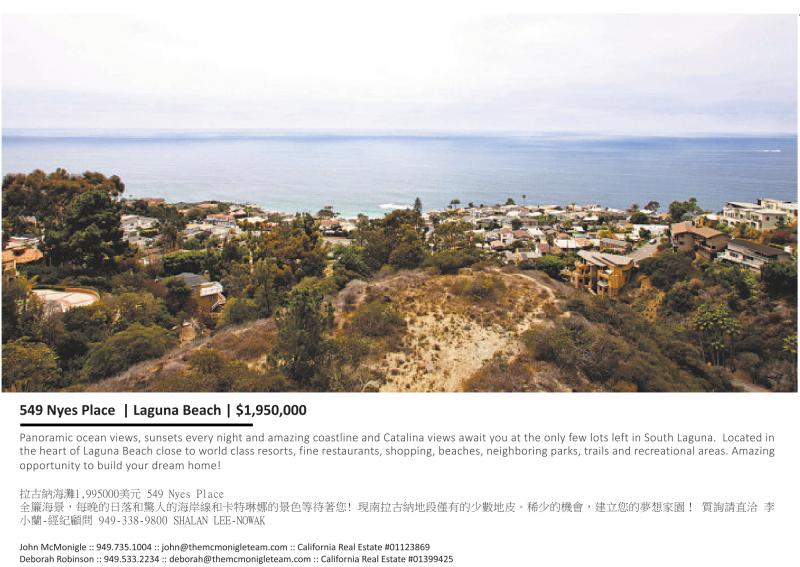 549 Nyes Place | Laguna Beach | $1,950,000 Panoramic ocean views, sunsets every night and amazing coastline and Catalina views await you at the only few lots left in South Laguna. Located in the heart of Laguna Beach close to world class resorts, fine restaurants, shopping, beaches, neighboring parks, trails and recreational areas. Amazing opportunity to build your dream home! John McMonigle :: 949.735.1004 :: john@themcmonigleteam.com :: California Real Estate #01123869 Deborah Robinson :: 949.533.2234 :: deborah@themcmonigleteam.com :: California Real Estate #01399425