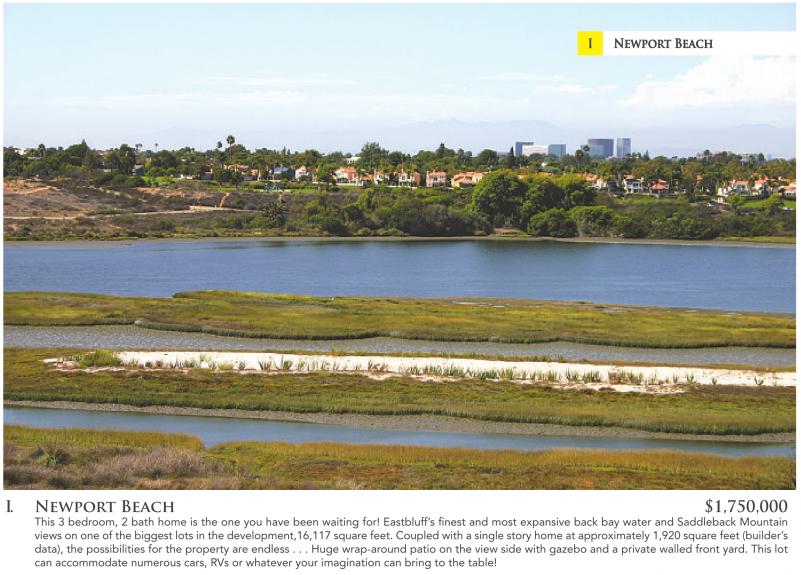I Newport Beach I. Newport Beach $1,750,000 This 3 bedroom, 2 bath home is the one you have been waiting for! Eastbluff’s finest and most expansive back bay water and Saddleback Mountain views on one of the biggest lots in the development,16,117 square feet. Coupled with a single story home at approximately 1,920 square feet (builder’s data), the possibilities for the property are endless . . . Huge wrap-around patio on the view side with gazebo and a private walled front yard. This lot can accommodate numerous cars, RVs or whatever your imagination can bring to the table! See also