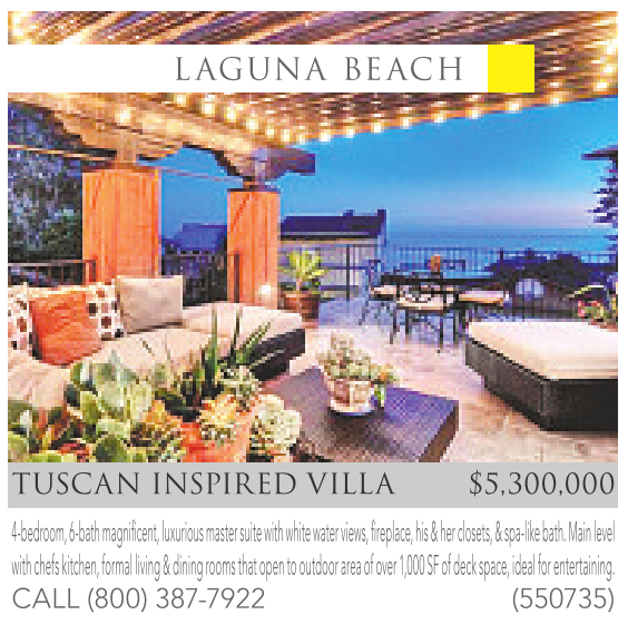 LAGUNA BEACH TUSCAN INSPIRED VILLA $5,300,000 4-bedroom,6-bathmagnificent, luxurious master suitewith whitewater views, fireplace, his&her closets,&spa-likebath. Main level with chefskitchen,formal living &diningrooms that open to outdoor area of over1,000 SF of deck space, ideal forentertaining. CALL (800) 387-7922 (550735) See also