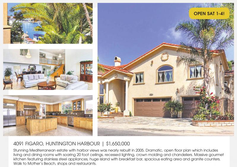 OPEN SAT 1-4! 4091 FIGARO, HUNTINGTON HARBOUR | $1,650,000 Stunning Mediterranean estate with harbor views was nearly rebuilt in 2005. Dramatic, open floor plan which includes living and dining rooms with soaring 20 foot ceilings, recessed lighting, crown molding and chandeliers. Massive gourmet kitchen featuring stainless steel appliances, huge island with breakfast bar, spacious eating area and granite counters. Walk to Mother’s Beach, shops and restaurants.
